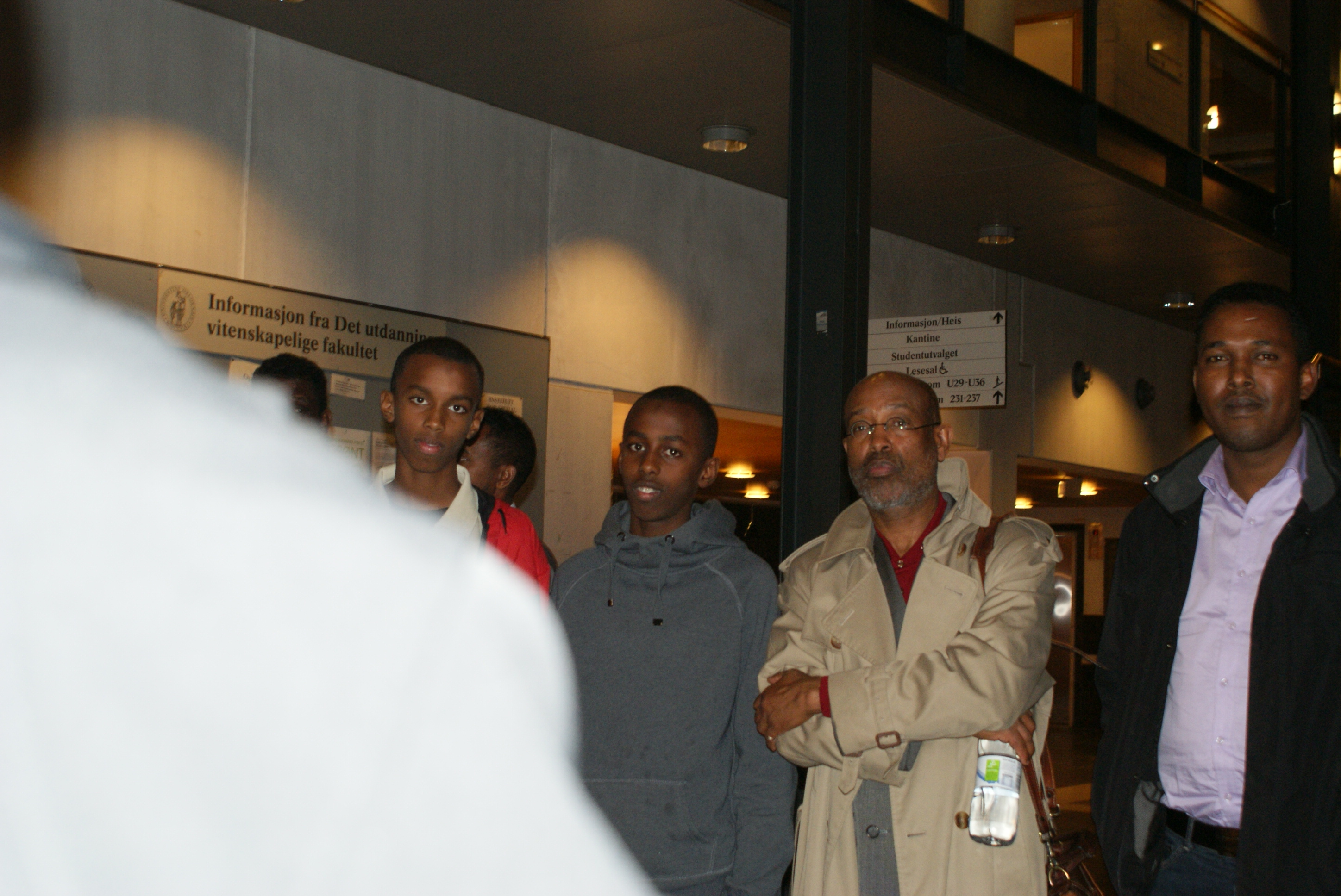 Somali Community in Oslo and Professor Ahmed Ismail Samatar standing outside in the front door Hall meeting.